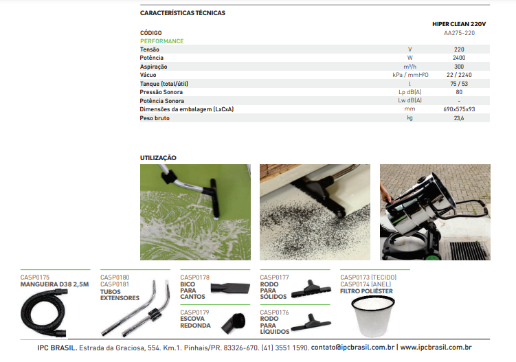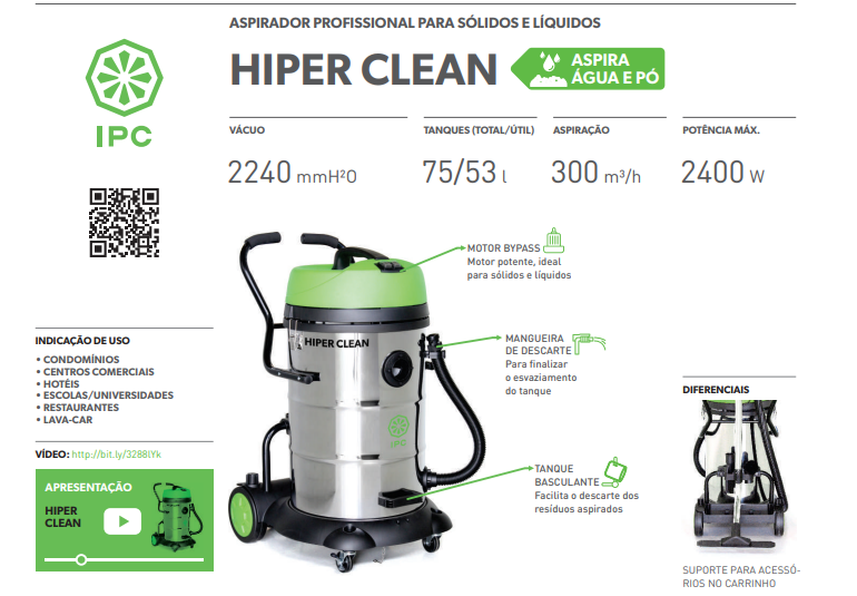 Aspirador de sólidos e líquidos de tanque 75 litros de 2 motores. Possui grande capacidade devido ao tanque, ideal para prestadores de serviço.